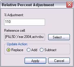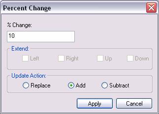 The Percent Change method multiplies current cell values by a specified percentage. The product of the multiplication can then replace, be added to, or subtracted from existing cell values.