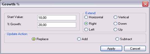 The Growth % method needs an initial value and a growth percentage. Using the initial value as a starting point, this method then sequentially increments all values in a range by the specified growth percentage.