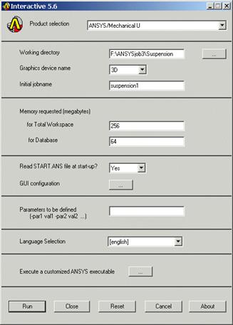 B. Enter a job name (suspension1). All ANSYS files created for this problem will have a filename of suspension1 followed by a unique extension.