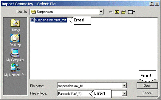 D. In the file list, highlight the file named suspension.xmt_txt. If you do not have a parasolid translator, select ANSYS (*db*) for type of file and import the suspension.db file.