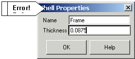 A. A pop up dialog box will come up for you to input a default property name and thickness for the model. Let's call this property Frame and use a thickness of 0.0875.