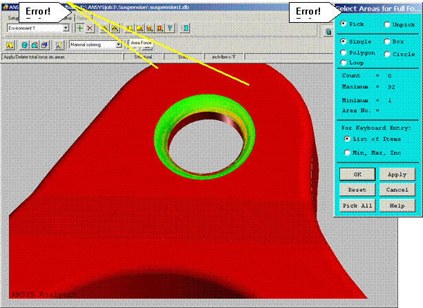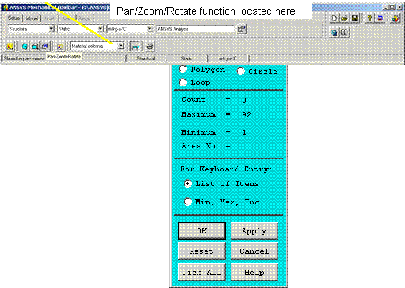 J. As before, a dialog box will pop up asking you to select the areas for the new shell properties. You may have to use the Pan/Zoom/Rotate function to obtain a better view of the center hole in order to select it.