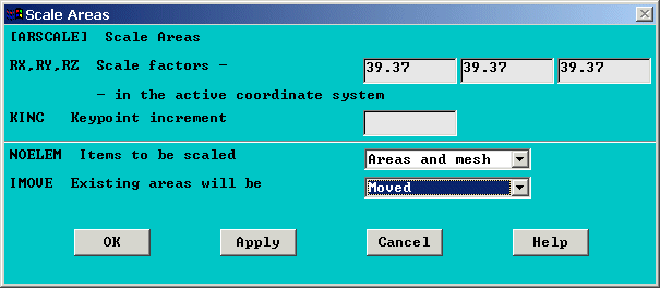 Parasolid models like the one we imported usually come from Unigraphics. If a UG model was built in English units (inches), UG converts the file to metric units (meters) when it writes the Parasolid file. When ANSYS imports this file, it has no way of knowing if the originating part was in English or Metric units, so it imports the file as is. In our case, we must convert the file back to English units. This involves scaling it back from meters to inches (multiply by 39.37).