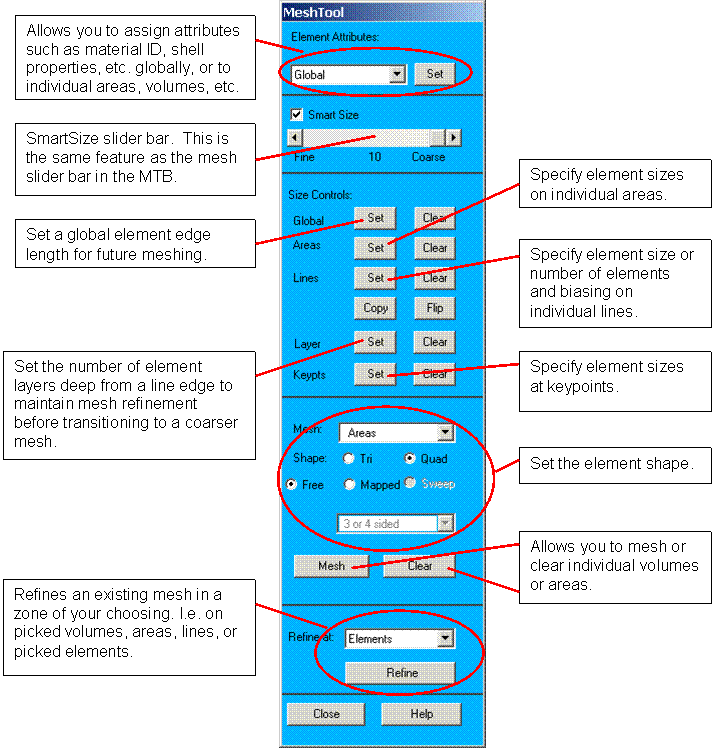 A. The slider bar in the MTB controls the SmartSize mesh density in various levels from very coarse (right most setting) to very fine (left most setting). We will use the default (center setting).