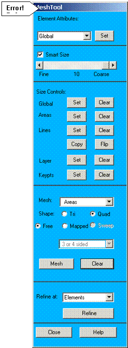 We will use the default SmartSize meshing to create an initial mesh on the part, then use the MeshTool to illustrate some advanced meshing features. These include specifying number of elements on lines, and mesh refinement.