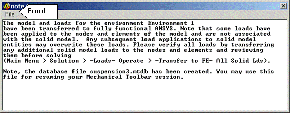 C. A warning message will appear indicating that loads have been transferred from the geometry to the nodes and elements and that care must be taken if/when subsequent loads are applied in full ANSYS. Dismiss this warning when you are through reading it.
