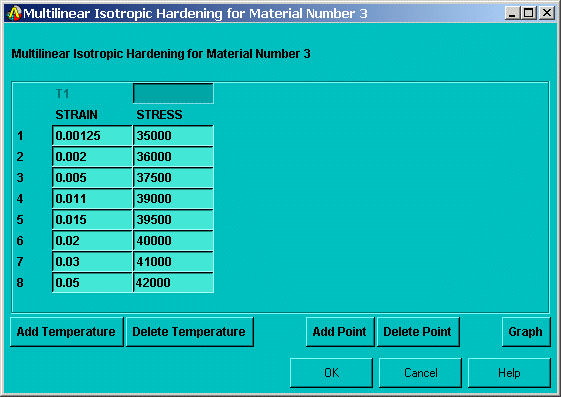If you wanted to enter another stress/strain curve for a different temperature, you could click on the Add Temperature button, and another column would appear. The temperature fields would now become active for you to define the temperature for each curve.