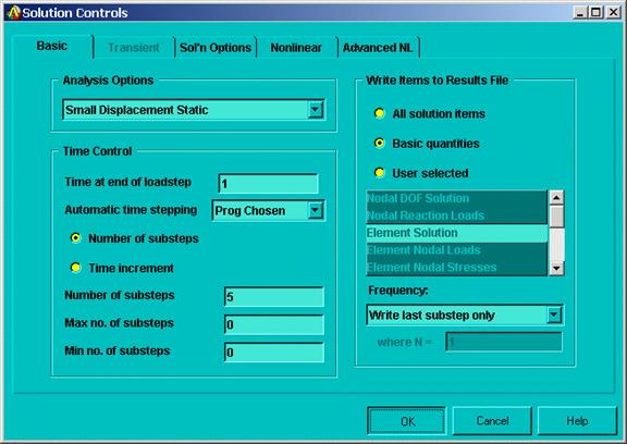We are now ready to perform the nonlinear analysis. By default, ANSYS Solution Control is activated when you define nonlinear material properties. This is a set of reliable and efficient default solution settings for nonlinear analyses. ANSYS will choose optimized default settings and advanced internal solution algorithms, which solve a majority of nonlinear problems with the least amount of user intervention. All the user must do is provide an initial step size for the analysis. Enter the solution module and define the initial number of time steps.