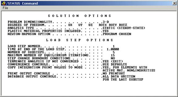 p Summary: Lists the path to the files used in the analysis and a summary of the maximum displacement and stresses for the environment solved.