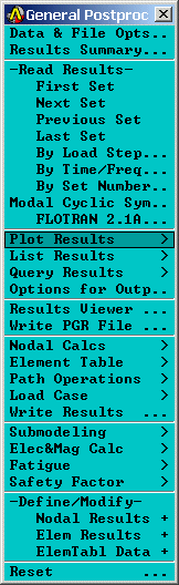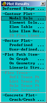 B. Since we just completed the solution while we were in the same ANSYS session, we don't have to read results because they are already loaded for us. Had we left ANSYS after solution and returned, we would have to load results data into memory using one of the options under -Read Results-. We can proceed directly to the plot menu. Click on Plot Results >.