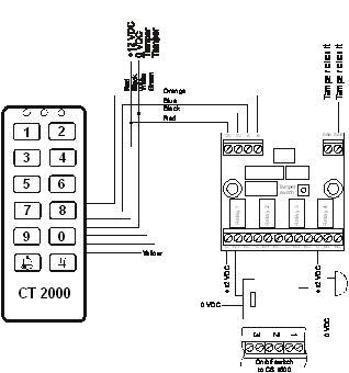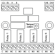 Introduction Box 485-4 is a door control unit, used together with CT 2000 keypad. The unit is delivered in a white joint box, space for cabling included. Box 485-4 is typically used if one CT 2000 keypad is to control more than one output. Typical applications: where CT 2000 normal functions shall be combined with keypad's bell button; silent attack alarm combined with f. ex. access to alarm on/off switch or door opening; access to alarm on/off switch, if extra safety required. Electric connections 12V +12 VDC GND 0 VDC (minus) A Connection to data bus via RS 485, in-/ output A, blue core B Connection to data bus via RS 485, in-/ output B, orange core SAB Tamper switch SAB Tamper switch C Relay output - common NO Relay output - normally open NC Relay output - normally closed |