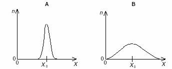 A quantity X is measured many times. A graph is plotted showing the number n of times a particular value of X is obtained. X has a true value X 0. Which graph could be obtained if the measurement of X has a large systematic error but a small random