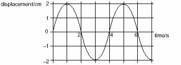 The graph shows how the displacement of a particle in a wave varies with time. Which of the following is correct? A The wave has an amplitude of 2 cm and could be either transverse or longitudinal.