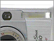 The focus assist lamp on this Canon PowerShot S50 is located above the lens and beside the flash. It serves a double purpose. Firstly it fires a beam of patterned white light in low light situations which helps the auto focus system to get a lock. Secondly, when the flash and anti-red- eye are enabled it remains lit for as long as you half-press the shutter release to reduce the size of the subject's pupils and thus reduce the chance of red eye.