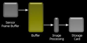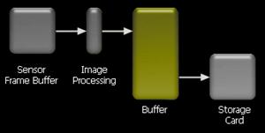 In this method no image processing is carried out and the RAW data from the CCD is placed immediately in the buffer. In parallel to other camera tasks, the RAW images are processed and written to the storage card. In cameras with this type of buffer, the number of frames which can be taken in burst mode cannot be increased by reducing image file size. But the number of frames per second (fps) is independent of the image processing speed (until the buffer is full).