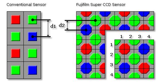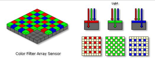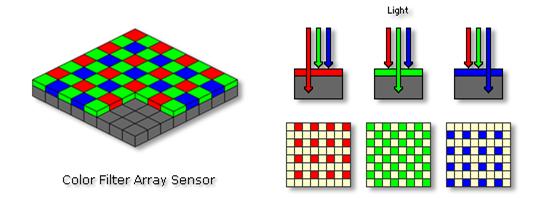Each "pixel" on a digital camera sensor contains a light sensitive photo diode which measures the brightness of light. Because photodiodes are monochrome devices, they are unable to tell the difference between different wavelengths of light. Therefore, a "mosaic" pattern of color filters, a color filter array (CFA), is positioned on top of the sensor to filter out the red, green, and blue components of light falling onto it. The GRGB Bayer Pattern shown in this diagram is the most common CFA used.