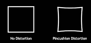 Pincushion distortion is a lens effect which causes images to be pinched at their center. Pincushion distortion is associated with tele lenses and typically occurs at the tele end of a zoom lens. The use of converters often amplifies the effect. It is most visible in images with perfectly straight lines, especially when they are close to the edge of the image frame. See also the opposite effect, barrel distortion.