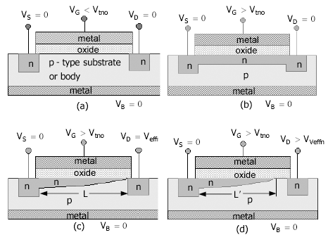 For VDS > VDSsat (active mode of operation), the channel length decreases from L to L' as the reverse-biased depletion region of the drain pn junction increases along the channel (along the oxide - semiconductor interface) [Fig. 3.1(d)]. The increment VDS - VDSsat drops across the depletion region of the drain pn junction. In long-channel devices, the reduction of channel length is relatively small compared to the channel length. In this case, the length is roughly a constant and the channel resistance, for a given VGS, is independent of VDS.