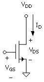 In electronic circuit applications, the terminal voltages are referred to the source; gate and drain voltages are designated as VGS and VDS (NMOS). In analog circuits, VGS > Vtno (in order for a channel to exist), VDS is positive, and a drain current flows through the channel and out by way of the source (and the gate current is zero). On the drain end of the channel, the voltage across the oxide layer is VGD = VGS - VDS. The channel at the drain end just shuts off when VGD = Vtno. VDSsat = VGS - Vtno [Fig. 3.1(c)] is defined for this condition as the saturation voltage. The transistor is referred to as in the linear (or triode) region or active region for VDS < VDSsat and VDS > VDSsat, respectively.