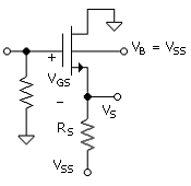 In Fig. 3.4 is shown an example of a circuit in which the body and source cannot be at the same voltage. We now use the four-terminal symbol for the NMOS, which includes the body contact. In most applications, the body would be tied to the lowest potential in the circuit (NMOS), in this case, VSS (e.g., VSS = -5 V). But by the nature of the circuit, the source voltage is VS = VSS + IDRS, such that the source-body voltage is VSB = IDRS.