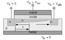 As VDS increases, but is less than Veffn [transition from Fig. 3.1(b) to (c)], the wedge-shaped effect on the channel is reflected functionally in the channel conductance relation as