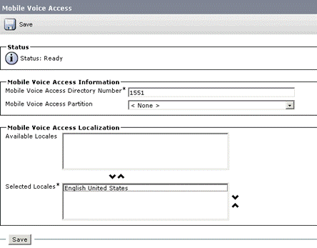 Mobile Voice Access allows two-stage dialing or a remote user Direct Inward System Access (DISA) access. The Mobile Voice Access feature relies on the Cisco Unified Mobile Voice Access Service, which MUST be activated manually from the Unified CM Serviceability configuration page.