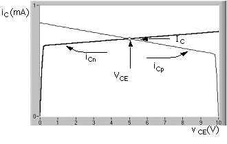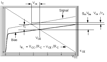The two components of (C.10) are illustrated graphically in Fig. C.3. The output characteristics are for two values of base - emitter voltage: bias only, VBE, and bias plus base - emitter signal voltage, VBE + Vbe. They are designated Bias and Signal. The solution to iC and vCE is constrained to the "load line," which is iRc = iC = VCC/RC - vCE/RC [(C.5
