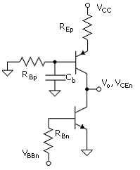 For the npn - pnp circuit of Fig. C.10, Rib at the base of the pnp is somewhat less than given by (C.70) because the effective load, that is, ron, is so large and the simplification made above, ro >> RL, is not valid. However, as is usually the case in design, such approximate forms are sufficient. This takes into consideration that exact solutions are not required or justified, given the variation in the model and circuit parameters that naturally occur.