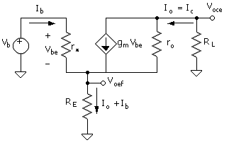 This is equivalent to a unity-gain amplifier with an output resistance of 1/gm. The output resistance is, for example, about 26 W at IC = 1 mA. Therefore, when an external load is attached to the emitter-follower stage output, the gain remains near unity for very small load values.