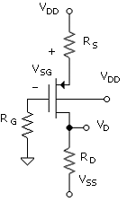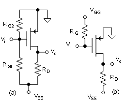 Dc circuits for the grounded-source amplifier are shown in Fig. 5.1 (PMOS). The circuit in (a) is based on a single power supply, and the gate bias is obtained with a resistor voltage-divider network. The circuit in (b) is for a laboratory project amplifier. Both VGG and VSS are negative, since the source is at ground. There is no voltage drop across RG since there is negligible gate current. RG is necessary only to prevent shorting the input signal, Vi. The bias current ID for a given applied VSG will respond according to ( ), which is