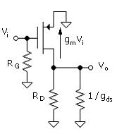 Note again that the signal schematic transistor represents a current source with value gmVi, as established in connection with Fig. 4.1. The additional feature of the transistor model is included with the addition of 1/gds. This resistance is actually part of the transistor and is between the drain and source of the transistor, but the circuit as given is equivalent, as the source is at ground. Since the output voltage is Vo = -IRDRD, the new gain result is