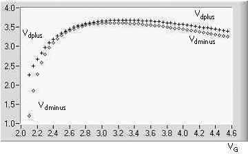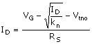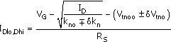 VGSo is obtained from ( ), using the nominal parameter values. The low and high current limits tend to converge on VG/RS as VG becomes large. That is, in the limit, VG dominates the voltages in the numerator of ( ), thus rendering the expression insensitive to the minor contributions from changes in kn and Vtno.