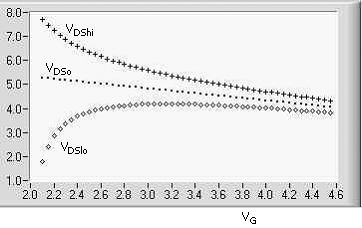 An optimization design sequence plots the limits for a range of VG and for specified dVtno and dkn. An example is shown in Fig. 5.11. The plot of VDSo corresponds to the nominal kno and Vtnoo. The curve slopes downward as ISRS increases for increasing VG at constant nominal bias current, IDo. VDShi is for the combination of dVtno and dkn, which gives the maximum positive deviation from the nominal, and VDSlo is the opposite. The example of Fig. 5.11 is for VDD = 10 V and design bias current of IDo = 100 mA and nominal parameters kno = 300 mA/V2, Vtnoo = 1.5 V, dVtno = 0.1 V, and dkn = 100 mA/V2. Experience with the CMOS chip of our amplifier project (Project 7) indicates that these are representative.