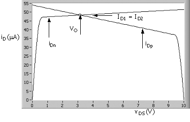 Figure 10.2 shows a SPICE plot of the current for the PMOS and NMOS transistors as a function of VDS1. The source - drain voltage for the PMOS is VSD2 = VDD - VDS1. Both transistors have a specific gate - source voltage. The solution for the output voltage for this case is about 3 V. A slight decrease in VGS1 or a slight increase in VSG2 is required to bring VDS1 to 5 V, the design result in this example. The increase in VSG2 would be implemented by making VSS more negative to increase the reference current. The steeper slope in the active region of the PMOS device is consistent with lp > ln, as in the project amplifier.