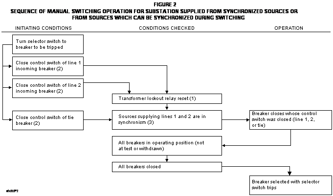 O,M V 3.4 Synchronized Sources. Figure 2 shows the sequence of manual switching for substations supplied from sources which are always in synchronism or which can be synchronized during the switching operation. A trip-selector switch shall be provided having the following features: