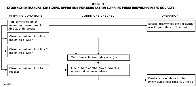 S V 3.3 The sequence of manual switching for substations supplied from unsynchronized sources is shown in Figure 3. The control scheme shall not permit paralleling the incoming lines during switching.
