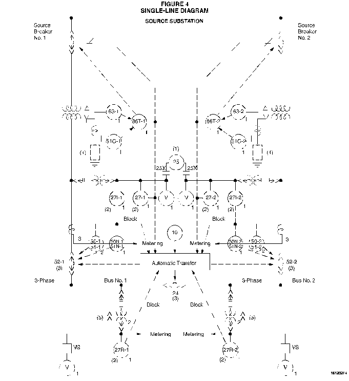 O,R 3.5 The arrangement of instrument transformers, relays, and meters shall be per the applicable parts of Figure 4. Figure 4 shows the single-line diagram of a secondary selective substation with automatic transfer having transfer initiation from the source substation and with transformer secondary protection.