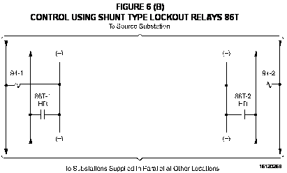 O 3.10 For shunt type lockout relays, relay coil supervision shall be provided by a "healthy trip" pilot light. When two or more substations at one location are supplied in parallel from a pair of feeders, only one shunt lockout relay per source breaker shall be provided at that location. See Figure 6. If these substations operate at different voltages, the lockout relays shall be located in the higher voltage switchgear.