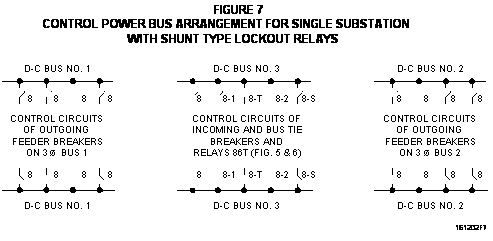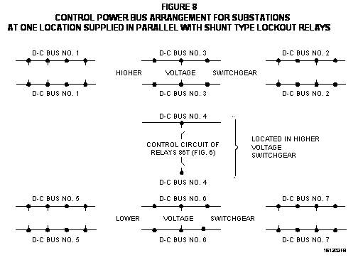 R 3.12 Arrangement of substation control power busses shall be as shown in Figure 7 or 8 for substations with shunt type lockout relays. For substations with series type lockout relays, bussing shall be per Figure 7 with only 3 branches off bus 3, except a fourth branch is required when synchronizing check facilities are provided.