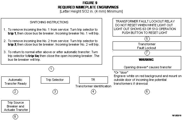 O 3.26 A nameplate shall be provided showing instructions for manual switching to remove an incoming line from service, and to return to normal after an automatic transfer or manual switching. Figure 9 shows a suitable nameplate for substations supplied from synchronized sources.