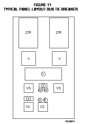 O 3.25 Arrangements of relays, control devices, and nameplates on switchgear front panels for incoming and bus tie breakers are shown in Figures 10 and 11. These arrangements shall be followed as closely as available panel space allows. All devices shown shall be located on the upper half section of the front panel. Switches and similar devices shall be located at a height convenient for personnel operation.