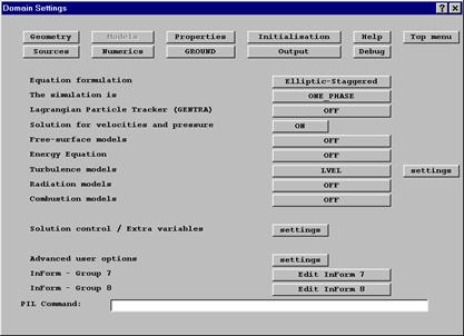 PHOENICS is used to specify the data pertaining to the continuous phase. This can be done using any of the means available in PHOENICS (ie, PIL commands, a library case or a menu). The continuous phase thus specified is then solved by EARTH in the usual way.