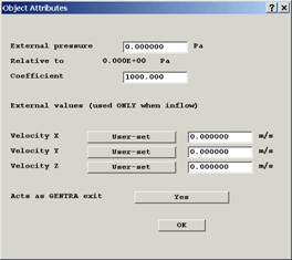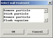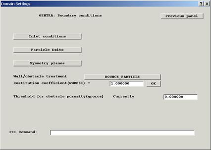 Walls and obstacles are defined in GENTRA (as in the rest of PHOENICS) through face and cell porosities (see the CONPOR command in the PHOENICS Reference Manual). The level of porosity that will be considered by GENTRA to be an obstruction for the particles can be set by the user; see the option POROSITY THRESHOLD in the BOUNDARY CONDITIONS panel.