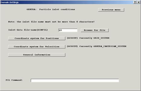 GENTRA is used to specify the data corresponding to the particulate phase. This can be done using the GENTRA menu (a part of the general PHOENICS-VR Main Menu which writes the GENTRA data at the end of the Q1 data-file), or by using in the Q1 file a subset of PIL variables specific to GENTRA. The particulate phase thus specified is then solved by GENTRA.
