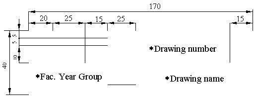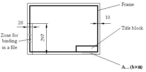 Any format will have a frame (border line) that is drawn with a thick, continuous line ( 1.2.2) and a title block ( 1.2.4), placed on the lower-right corner, stuck to the frame (fig. 1.2). The frame is drawn at 10mm from the edge of the format, all around it, and on the lower-left side, at 20mm, on 297mm height (the height of the smallest format, A4, or of an A3, format when is set on the long side). On the lower-right corner, under the title block, the format size is to be written like: A.(basis x height).