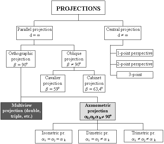 Technical drawing relies on orthogonal (orthographic) projection, which supplies the best conditions for describing shape of an object, and it is best fitted to make dimensioning, which is the second function of a technical drawing.