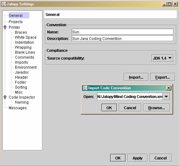 Click an 'Import' button in 'General' section and specify the path to MIND jalopy preferences file: n:\jalopy\Mind Coding Conventions.xml