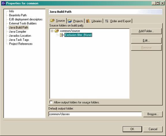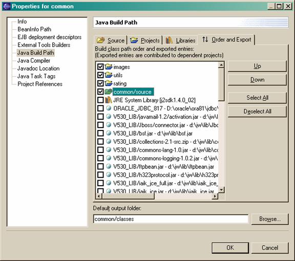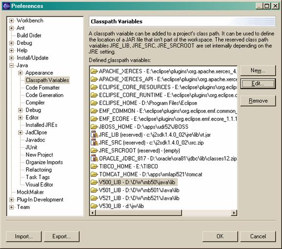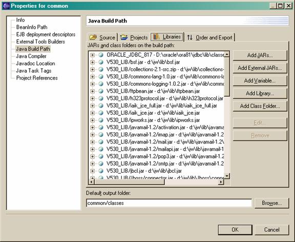 In the libraries tab you will be able to define all the classpath libraries. All our standard libraries (jw/lib, oracle) are imported relative to corresponding classpath variables. Project descriptions which are using those variables are stored in StarTeam. In section 6.1 (Preparations) you've set the values of these variables on your local hard drive once and for all, so your project libararies definition should point to the correct sources.
