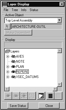 The Layer Display dialog box (shown in Figure 11-1) appears when controlling the display of layers. The dialog box lists all currently defined layers. Icons, adjacent to each layer name, indicate the layers' display statuses. You can blank, show, and isolate layers. The buttons shown in Table 11-1 appear at the bottom of the dialog box and allow you to set the status.