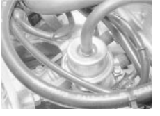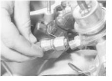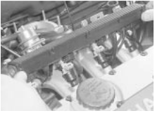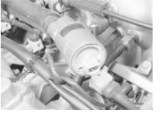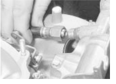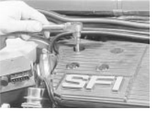 8 Disconnect and plug the fuel hoses from the fuel rail stubs. The hoses are different sizes and one of them carries a white band for identification. Be prepared for fuel spillage.